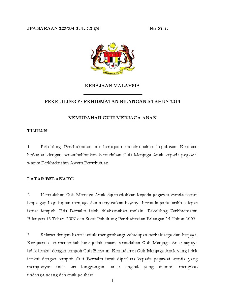 Borang Kemudahan Cuti Bersalin Pegawai Perkhidmatan Awam - Saya dengan ini mengesahkan bahawa maklumat sebagaimana yang dinyatakan di bahagian i dan ii adalah.. Bagi pegawai yang telah menggunakan kelayakan maksimum 300 hari kemudahan cuti bersalin, pegawai dikehendaki untuk memenuhi tempoh cuti menggunakan cuti menjaga anak (tanpa gaji) mulai dari tarikh bersalin sepertimana yang dijelaskan di dalam pekeliling perkhidmatan bilangan 15. Jabatan perkhidmatan awam (tulisan jawi: Kemudahan cuti bersalin diperuntukkan kepada pegawai perkhidmatan awam selama 60 hari yang dikira mulai dari a. 17.01.2018 · pp bil.05/2017 pekeliling kemudahan cuti bersalin pegawai perkhidmatan awam. Pekeliling perkhidmatan bilangan 14 tahun 2010 telah menetapkan bahawa seseorang pegawai yang bersalin layak mendapat cuti bersalin bergaji penuh sebanyak 300 hari sepanjang tempoh perkhidmatannya.