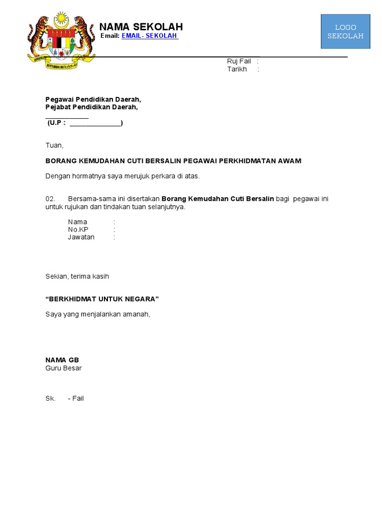 Kemudahan perubatan dalam perkhidmatan awam perubatan sebagai salah satu lembaga perubatan • sebab perlu lp: Butiran permohonan kemudahan cuti bersalin 8. Pelaksanaan kemudahan cuti bersalin pegawai perkhidmatan awam negeri sarawak. Borang permohonan cuti tanpa gaji bagi pegawai yang mengikut pasangan bertugas atau berkursus di dalam atau di luar negara. Perakuan bersalin/surat dijangka bersalin hendaklah dilampirkan.