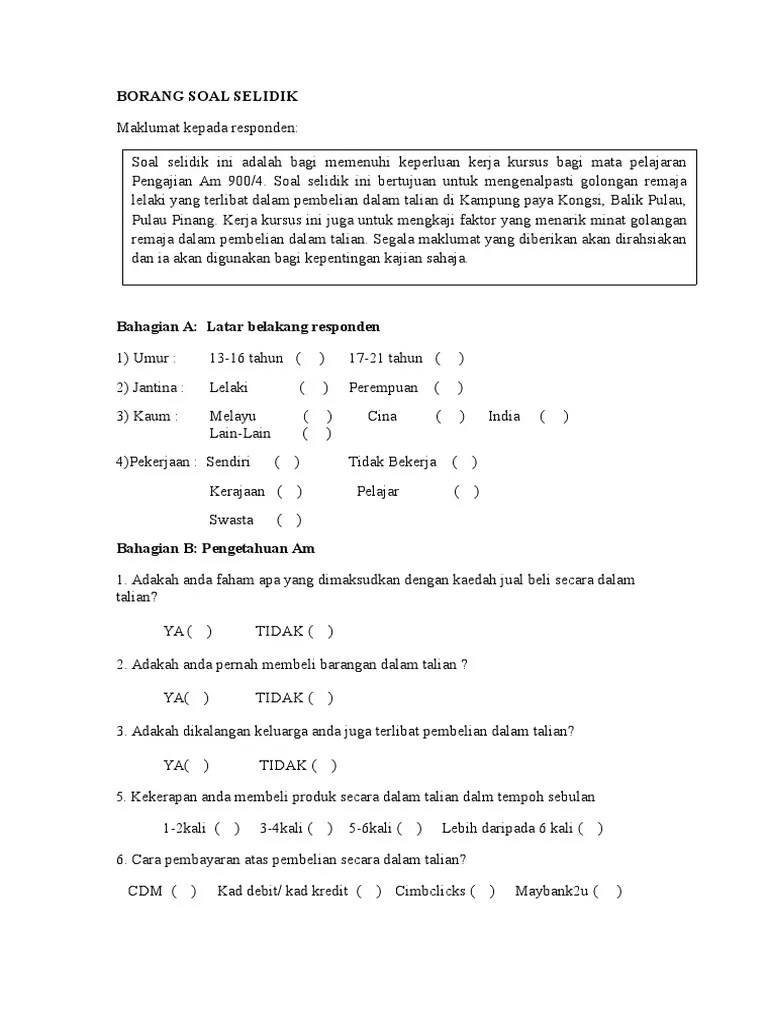 Contoh Borang Soal Selidik Kajian Pengajian Am from imgv2-2-f.scribdassets.com Blog contohkia memiliki banyak koleksi gambar seperti contoh borang jika hanya ingin memperbesar, silahkan klik gambarnya saja. Assalamualaikum/salam sejahtera,  soal selidik ini bertujuan untuk mendapatkan maklum balas tentang kurangnya semangat berpasukan dalam kalangan masyarakat desa tambun indah sebagai. Borang kaji selidik (2) via www.slideshare.net. Sikapdan minat pelajar terhadap matematik via www.slideshare.net. Contoh soalan persamaan kuadratik contoh soalan kajian kes pengajian perniagaan peng. Pilih satu jawapan dengan menandakan ( / ) dalam. Contoh borang soal selidik contoh soal2 via contohsoal2 pbs stpm contoh soal selidik dan penyusunan data dapatan via slideshare borang soal borang soal selidik kerja kursus pengajian am kod mata pelajaran 900 4. Contoh borang soal selidik reka bentuk organisasi contoh u via contohu.blogspot.com.