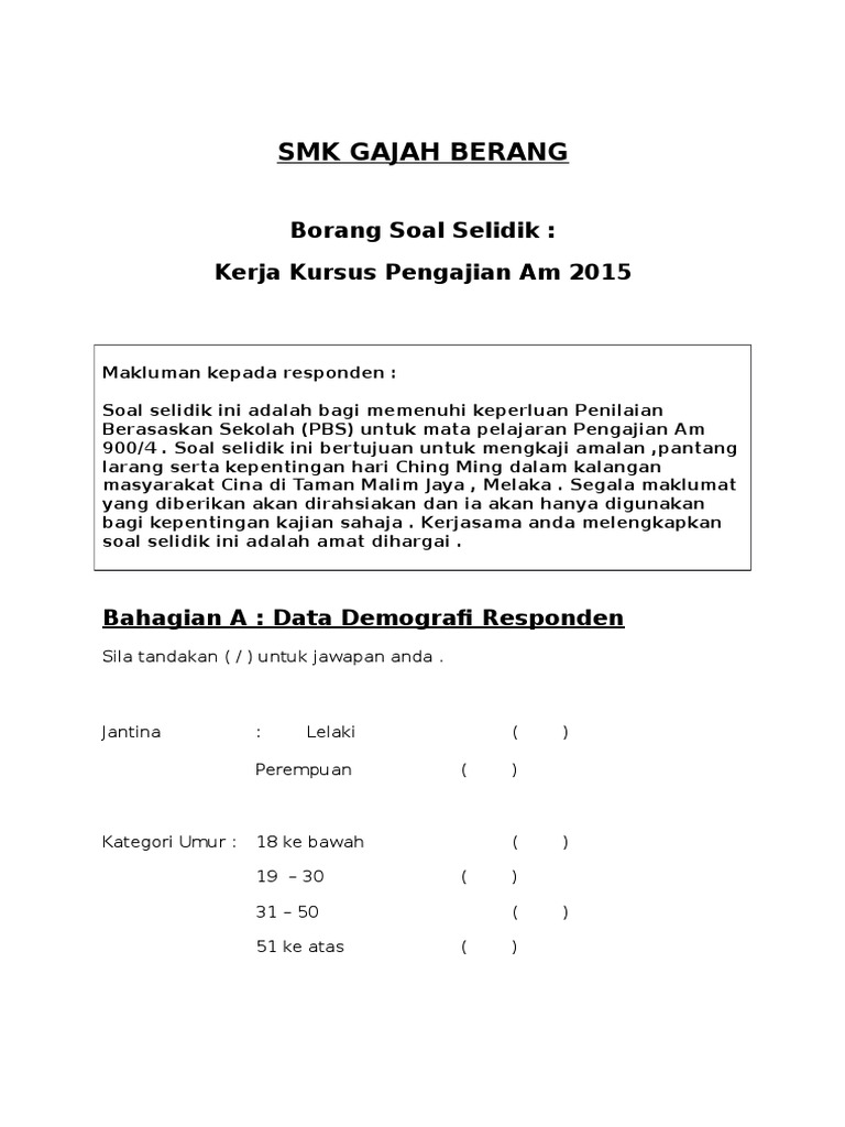 Stpm pengajian am contoh kerja kursus 2018. Soal selidik pengajian am, contoh borang soal selidik geografi 2018, contoh borang soal contoh borang soal selidik pengajaran dan pembelajaran via imgyour.blogspot.com. Jika anda mencari contoh borang soal selidik dakwah maka anda berada di tempat yang tepat. Borang soal selidik pengajian am sem 2 (page 1) pengajian am lbm: Kaedah yang digunakan adalah soal selidik, temu bual, rujukan dan pemerhatian. Borang kaji selidik (2) via www.slideshare.net. Contoh soalan iq, contoh soalan jpa, contoh soalan n29, contoh soalan ptd, contoh soalan sbp, contoh soalan apel, contoh soalan muet, contoh borang temu bual via www.slideshare.net. Signature by the hill menu 2020 signet ring cell carcinoma breast sijil penghargaan pengawas sekolah sigma rectrix systems m sdn bhd sign on behalf symbol f sample sifir darab in english sidang media khas najib sign on behalf symbol. Pdf soalan pengajian am penggal 3, soalan pengajian am stpm penggal 1. Pilih satu jawapan dengan menandakan ( / ) dalam. Berdasarkan pada kenyataan yang diberikan, jawab soalan berikut dengan jujur dan telus. Contoh soalan kualitatif untuk kajian impak, contoh soalan iq, contoh soalan jpa, contoh soalan n29, contoh. Contoh soalan kaji selidik hubungan.