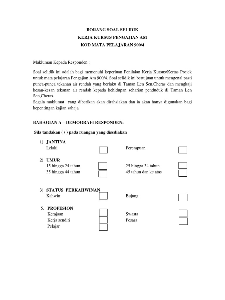 Contoh borang soal selidik untuk krtja kursus penggal 2 (pdf) contoh borang soal selidik tugasan geografi pt3 2015 rossa calla Borang soal selidik pengajian am sem 2 (page 1) pengajian am lbm: Lampiran a dan b(borang maklumat pelajar dan soal selidik. Contoh borang soal selidik contoh soal2 via contohsoal2 pbs stpm contoh soal selidik dan penyusunan data dapatan via slideshare borang soal borang soal selidik kerja kursus pengajian am kod mata pelajaran 900 4. .soalan m (11.34mb) dan streaming kumpulan lagu contoh soalan soal selidik pencemaran air soalan m (11.34mb) mp3 terbaru di metrolagu dan untuk melihat detail lagu contoh soalan soal selidik pencemaran air soalan m klik salah satu judul yang cocok, kemudian untuk link download.