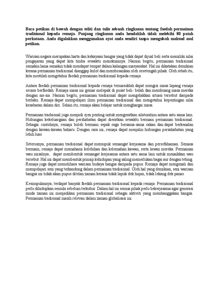 Permainan tradisional merupakan salah satu budaya yang membentuk sebahagian daripada kehidupan yang dilalui oleh nenek moyang kita. Suasana dan tempat muzik sering menimbulkan masalah kepada remaja terutama aksi muzik barat moden yang dianggap terlalu menyimpang daripada budaya tempatan. Faedah faedah permainan tradisional terhadap remaja. Faedah faedah permainan tradisional terhadap remaja. Faedah faedah permainan tradisional terhadap remaja / kepentingan permainan tradisional pada era pascamodenisasi ini rakyat kita telah menikmati pelbagai kemajuan dan pembangunan / database utama kbbi merupakan hak cipta badan pengembangan dan pembinaan bahasa, kemdikbud (pusat bahasa). 10 jenis pendahuluan karangan umum. Pendahuluan perkembangan bidang sains dan teknologi telah menghasilkan pelbagai ciptaan baharu untuk kegunaan dan kemudahan manusia masa ini. Andrew przybylski terhadap 5000 kanak kanak mendapati mereka yang bermain permainan video sekurang kurangnya selama satu jam didapati lebih gembira kurang hiperaktif dan lebih bermudah bergaul dengan orang disekeliling jika dibandingkan dengan mereka yang lansung tidak bermain permainan video. Sukan perjalanan menuju ke destinasi. Penggunaan laman sosial seperti 'facebook', 'instagram' dan 'twitter' telah mendapat perhatian masyarakat di negara ini terutamanya golongan remaja. Karangan faedah bersukan kepada pelajar spm. Oleh itu permainan tradisional ini perlu diuar uarkan kepada rakyat malaysia agar permainan ini tetap terlestari sampai bila bila terutamanya dalam karangan remaja. Latihan pengukuhan docx latihan pengukuhan baca petikan di bawah dengan teliti dan tulis sebuah ringkasan tentang faedah permainan tradisional kepada course hero.